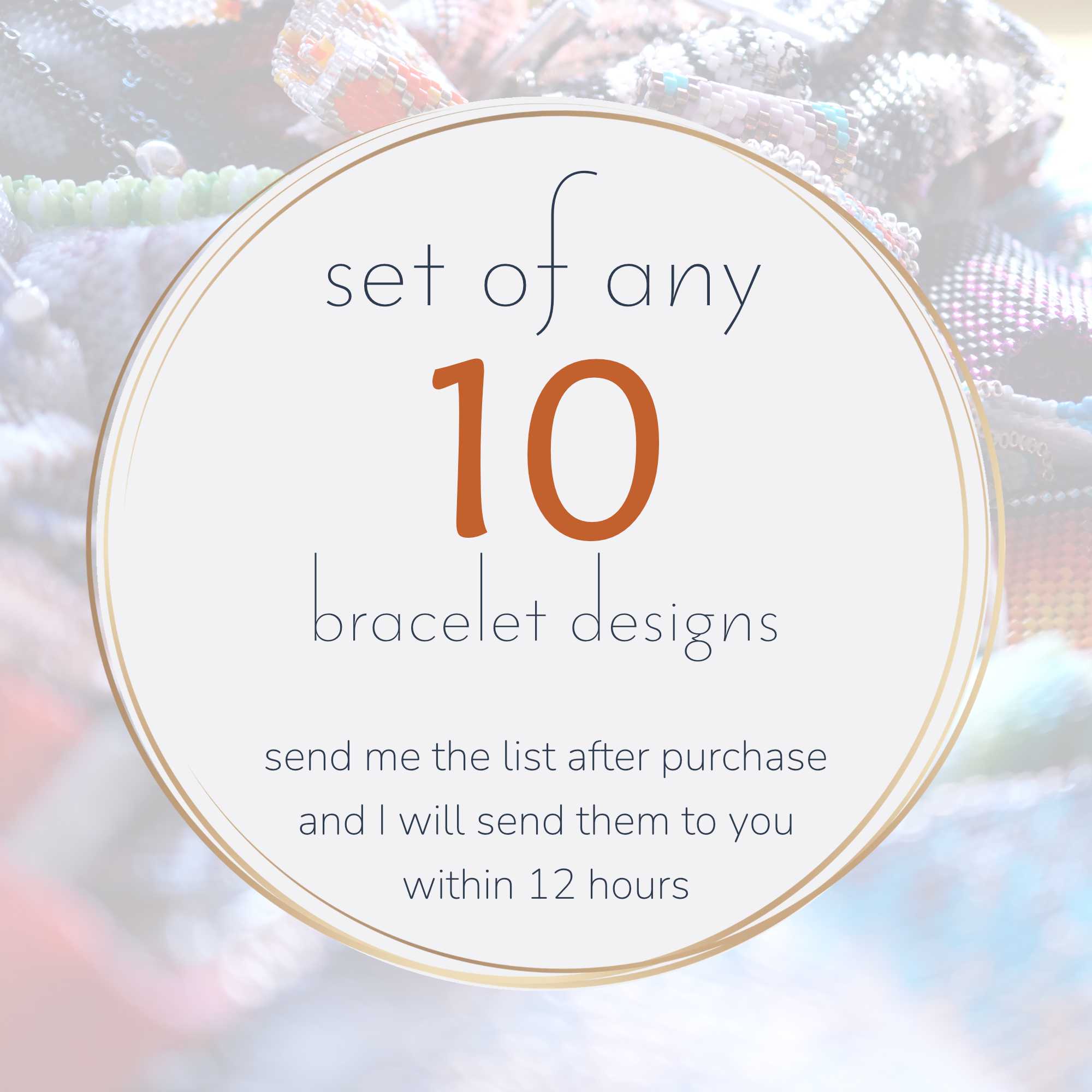 After confirming the payment, you will download a PDF file with my contact info. Please send me a list of 10 bracelet patterns of your choice and I will send them to you within 12 hours.