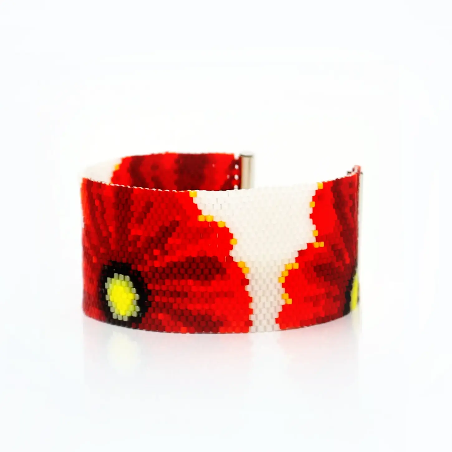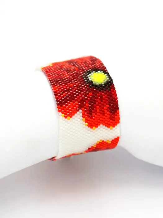 Red poppy peyote bracelet pattern. “Poppy Vibes” cuff shows realistic red poppies against a crisp white background. A botanical-inspired, wearable floral artwork that captures summer beauty in every bead.