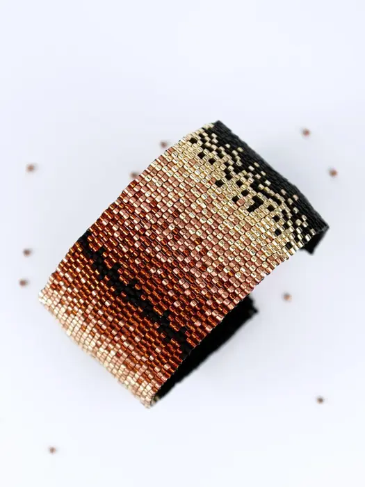 2-drop peyote cuff “Horizon of Illusion” with smooth black-to-gold ombre. Even count pattern creates elegant, minimalist gradient with subtle pixelated effect. Perfect modern statement for sophisticated wrists.