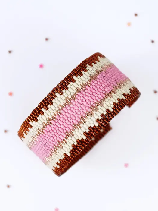 2-drop peyote cuff pattern “Rustic Cake” shows pink and white layers with copper accents, resembling a cozy dessert. Even count bracelet chart creates a whimsical, sweet, and charming accessory for jewelry lovers.
