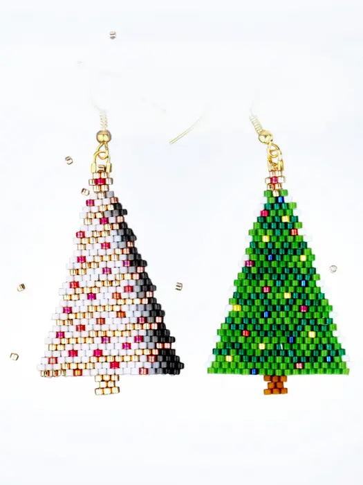 Two festive Christmas tree earrings in one pattern: classic green and chic white-and-gold. Lightweight brick stitch dangles make fun holiday accessories or quick, handmade gifts, offering playful, versatile style.