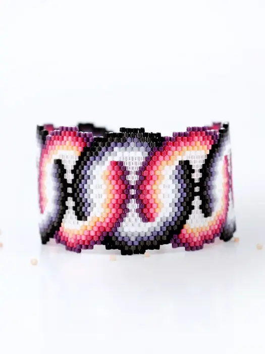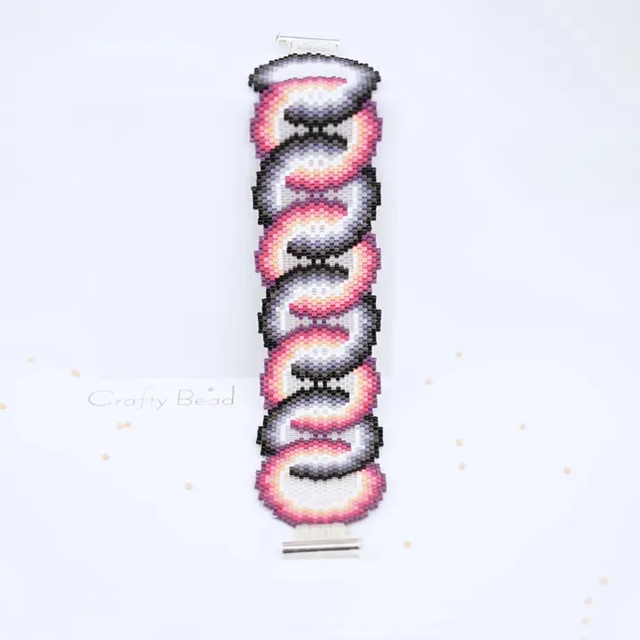 Interlocking pink, purple, and grayscale rings form a retro 60s cuff. Advanced peyote and brick stitch with precise decreases create a graphic pop-art bracelet that stands out as a bold, colorful statement piece for experienced beaders.