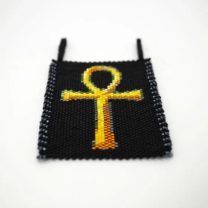 Egyptian Ankh peyote tapestry pattern in gold on black. Create a sacred wall piece featuring the key of life symbol, with step-by-step looped edge and hanging instructions. Meditative, spiritual, and striking decorative art.