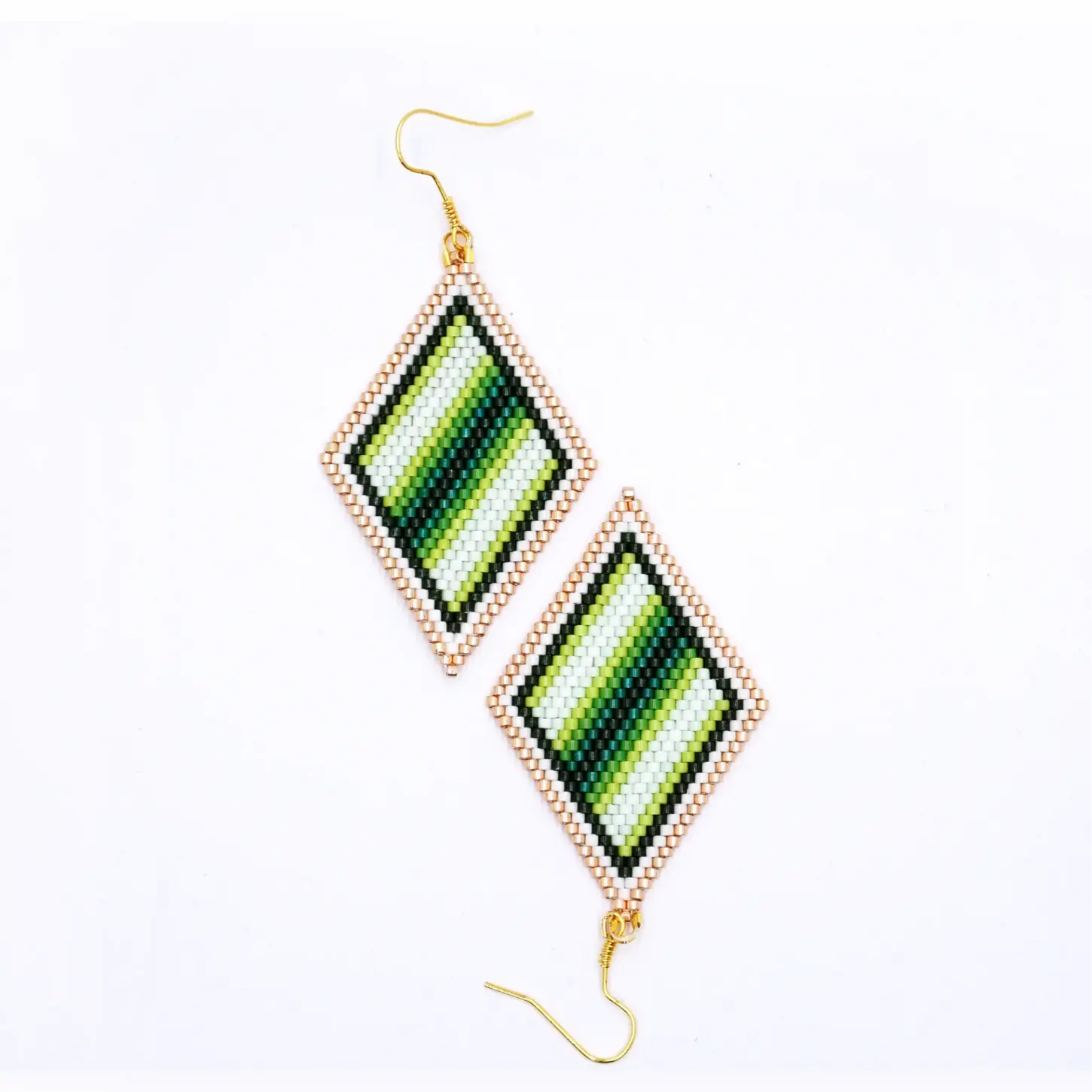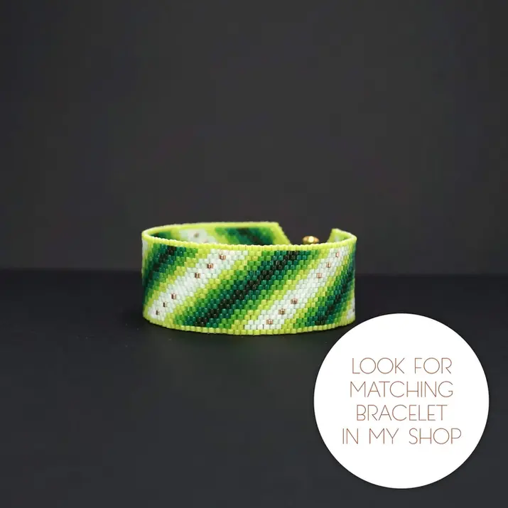 Brick stitch earrings pattern with green ombre diagonal stripes and gold border. “Good Luck” diamond dangles create a geometric lucky charm design, lightweight and perfect for festive accessories.
