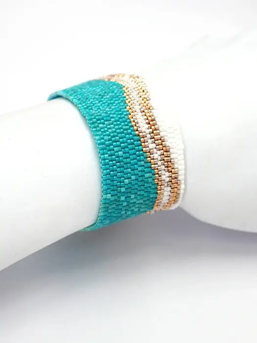 Ombre turquoise bead loom bracelet pattern with ocean waves and golden shore. Loom weaving creates smooth, elegant coastal cuff, perfect for makers who love rhythmic, meditative, wearable seascape art.