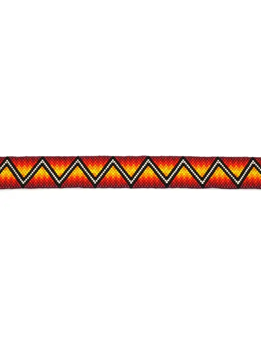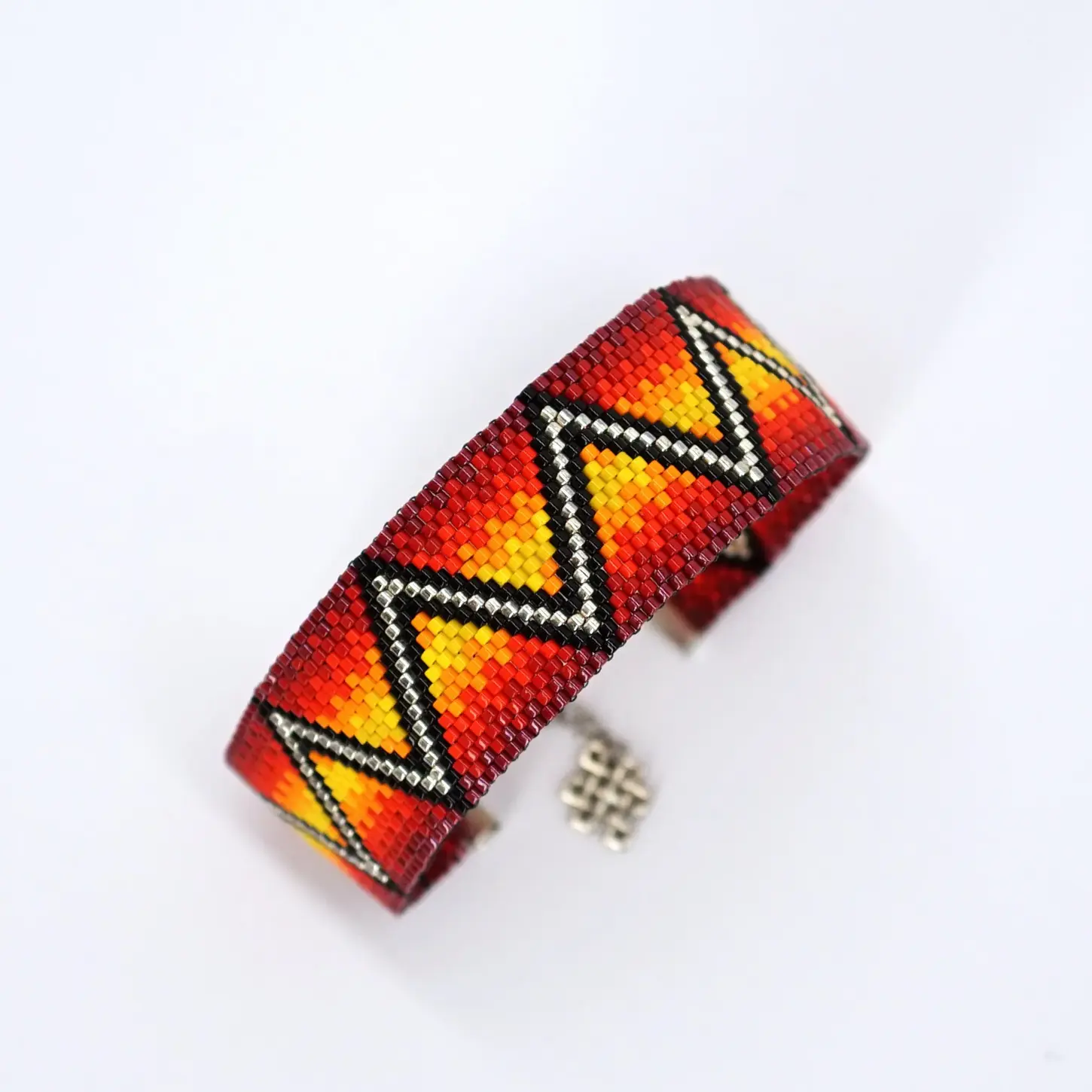 Fiery peyote bracelet pattern with geometric zigzag in red, orange, and yellow on black cuff. Volcanic-inspired design uses even-count peyote for bold, molten effect—perfect for dramatic, statement-making wearable art.