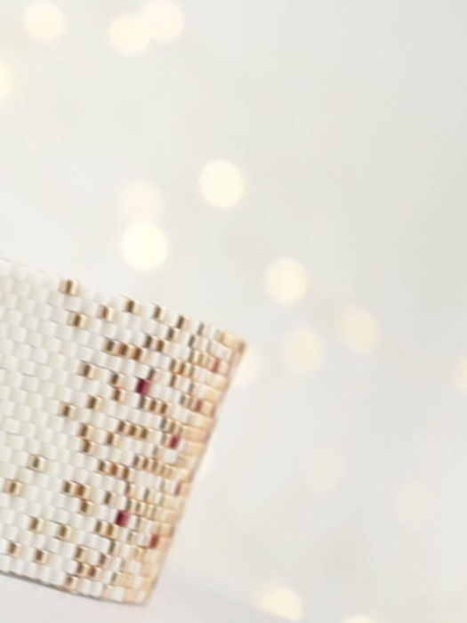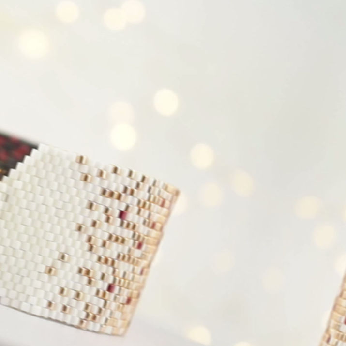 Sunset ombre peyote bracelet pattern with gradient from gold and white to ruby red and black. “Fiesta Time” cuff delivers a dramatic evening statement, perfect for proms, parties, and bold occasion jewelry.