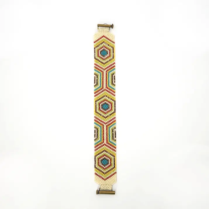 Retro hexagon peyote bracelet pattern in turquoise, yellow and brown. “Groovy Tune” delivers funky 70s inspired geometry in a repeating honeycomb layout. Even count cuff chart for bold vintage style beadwork.