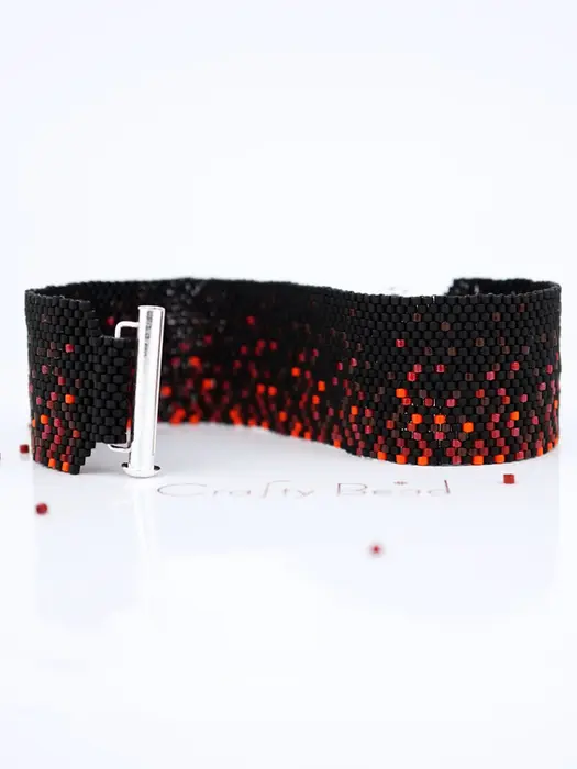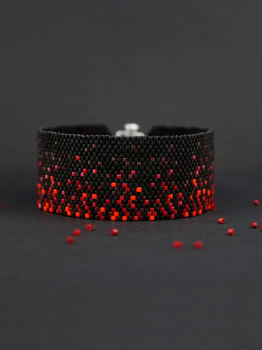Red, orange, and black ombre mimics glowing lava across this peyote cuff. Even count stitch ensures smooth gradient, producing a fiery, punk-inspired bracelet perfect for dramatic statement wear with rock-and-roll energy.
