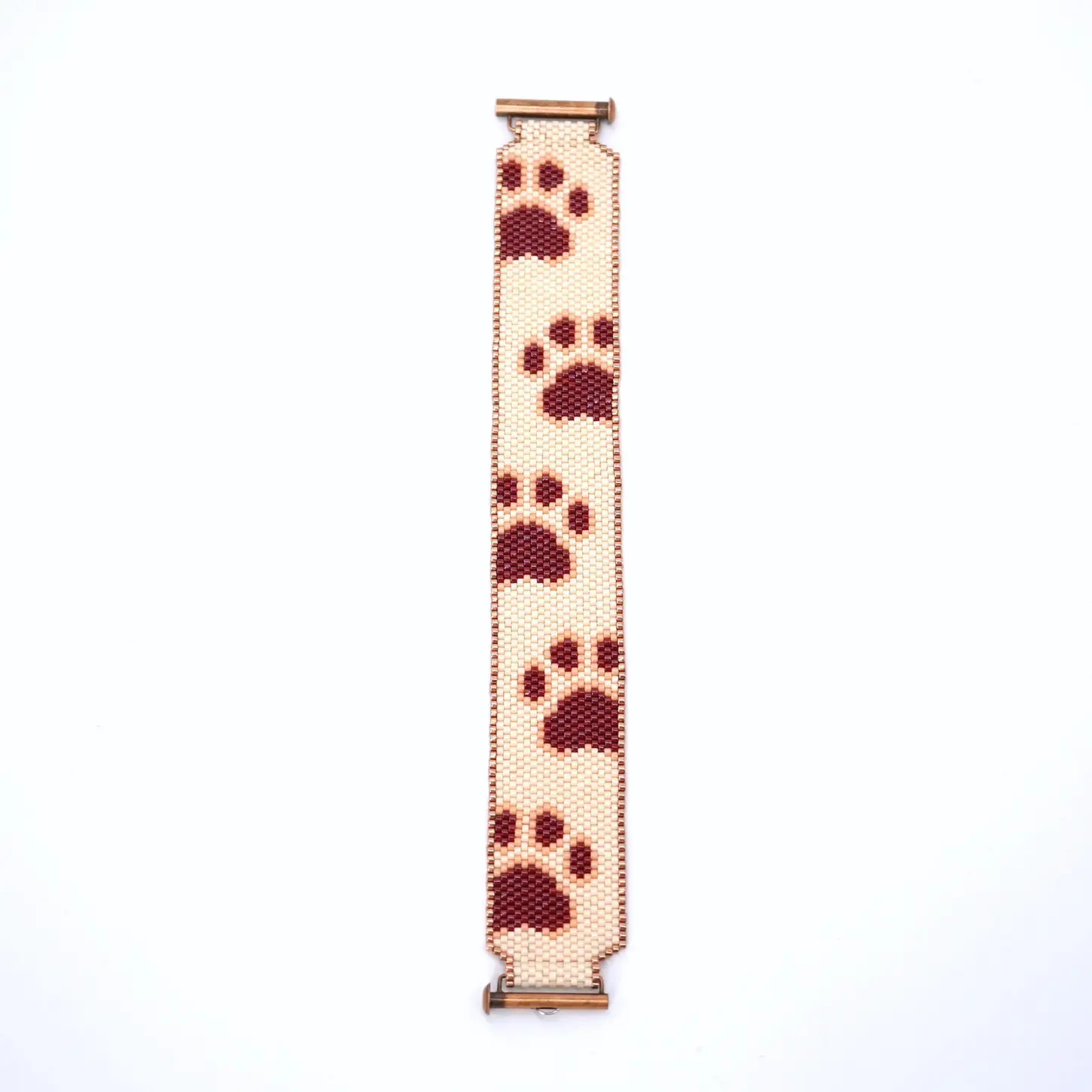 Cute paw print peyote bracelet pattern on soft cream background. “High Five Paws” features a vertical trail of reddish brown paw motifs in an easy even count cuff, ideal as a sweet handmade gift for pet lovers.