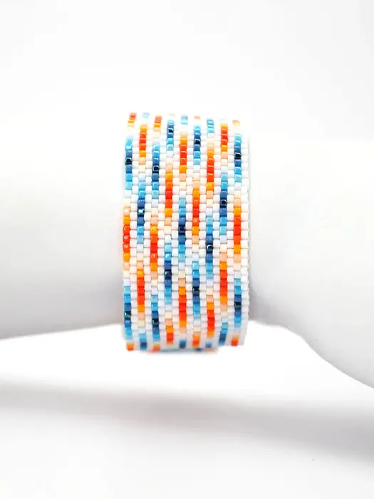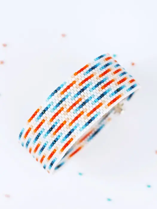 Abstract waterfall peyote bracelet pattern with cascading blue and orange lines. “Spry Cascade” creates a kinetic digital rain effect on white background. A modern even count statement cuff.