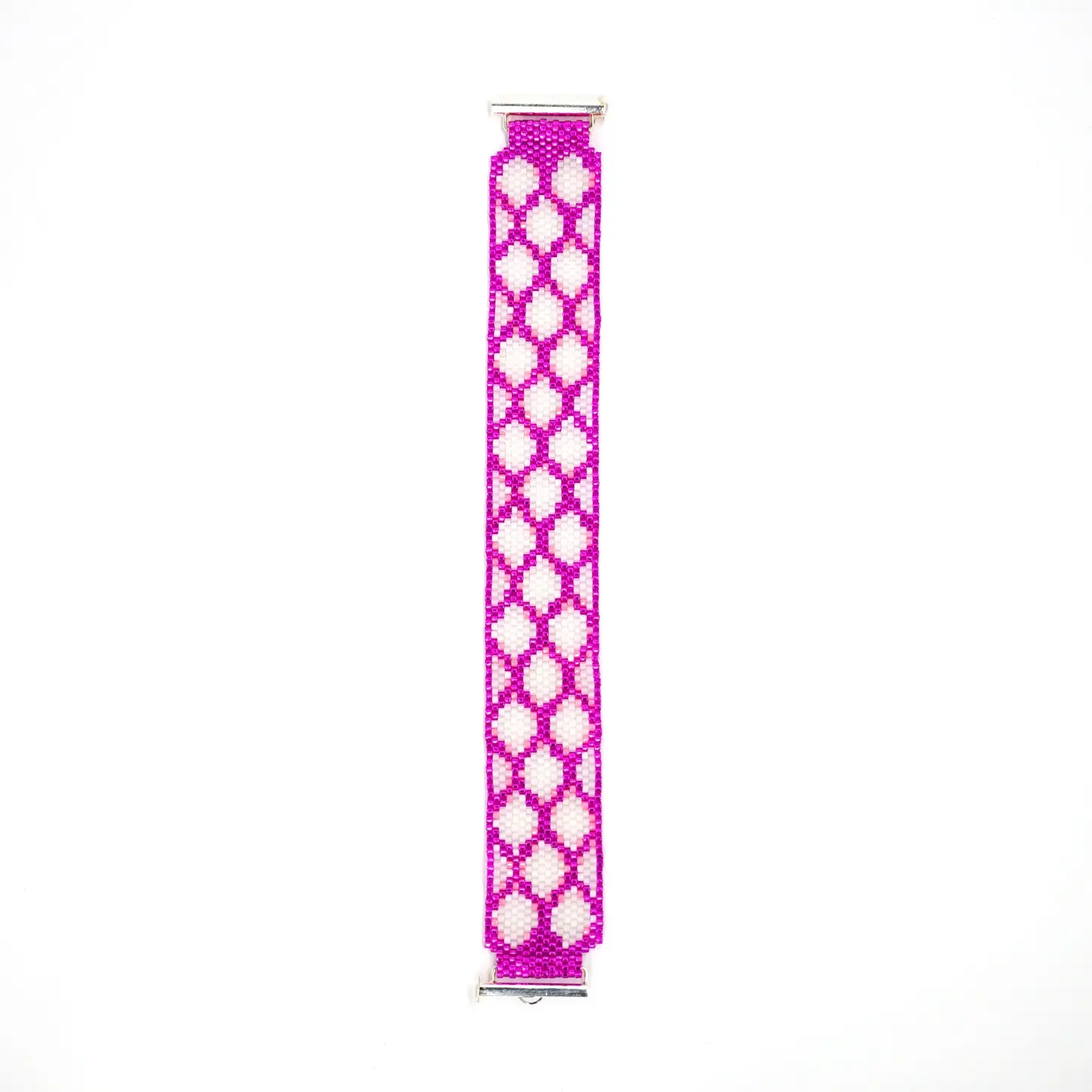 Bold honeycomb peyote bracelet pattern in hot pink and magenta. “Twisted Fun” cuff showcases a graphic hexagon grid on white, creating a playful geometric statement piece for modern, confident jewelry lovers.