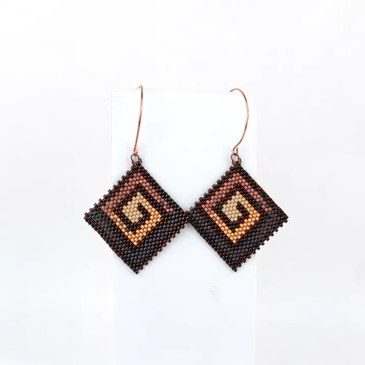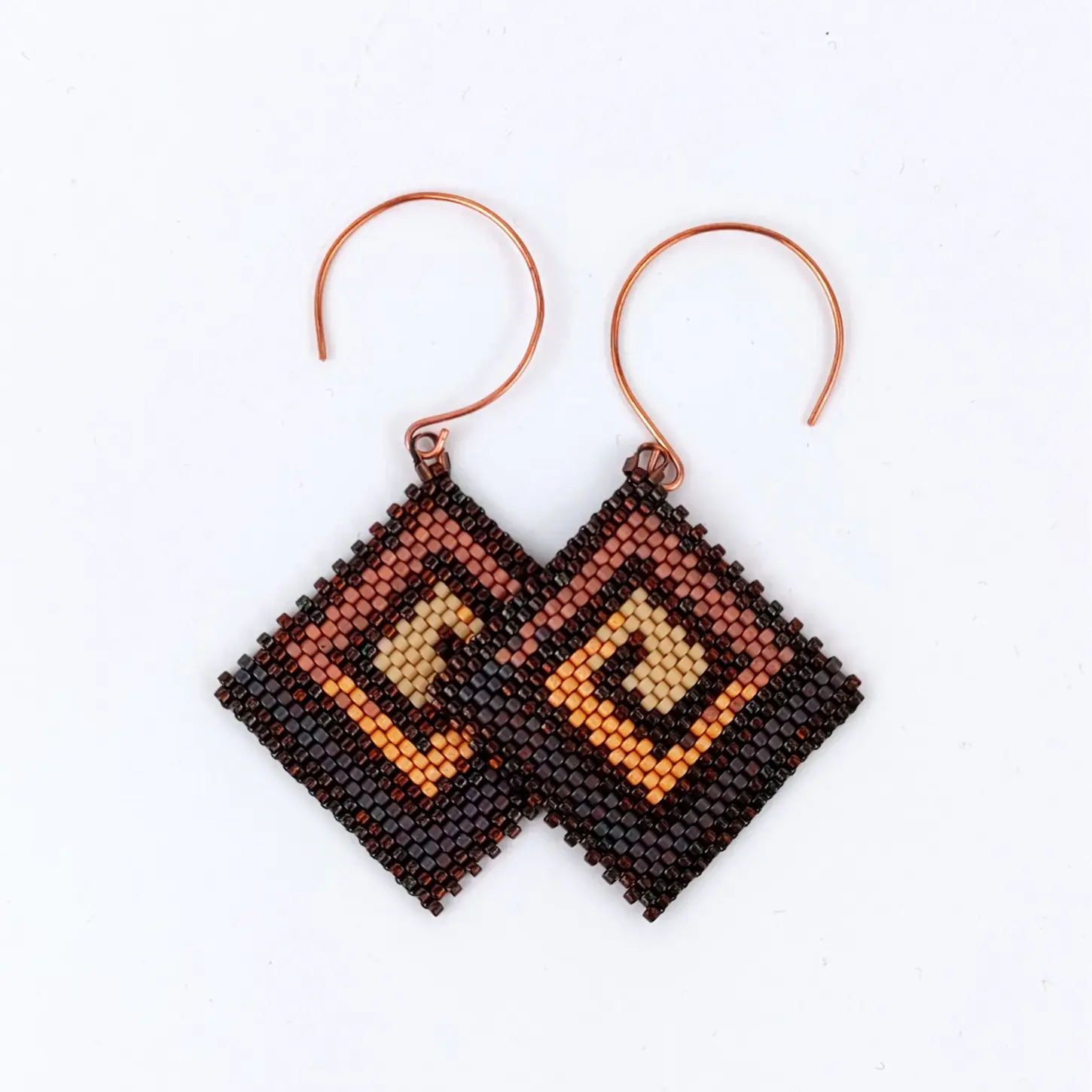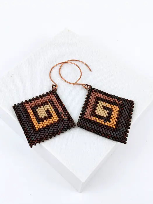 Square spiral earrings in warm chocolate ice cream tones, woven with Miyuki Delica beads. Geometric, hypnotic pattern with a subtle depth effect. Lightweight, precise, and quietly addictive. A small loop you’ll keep coming back to.