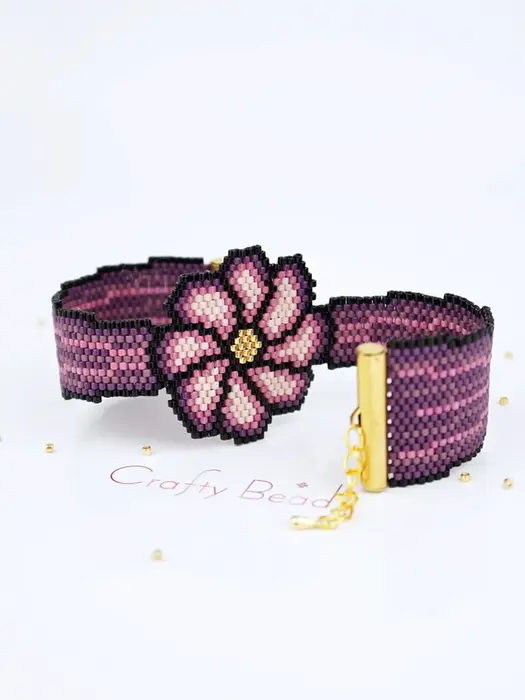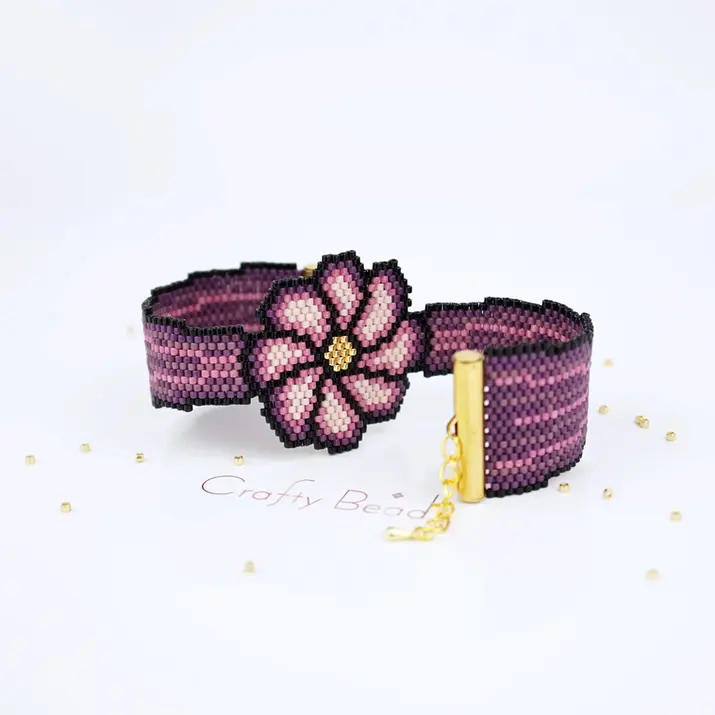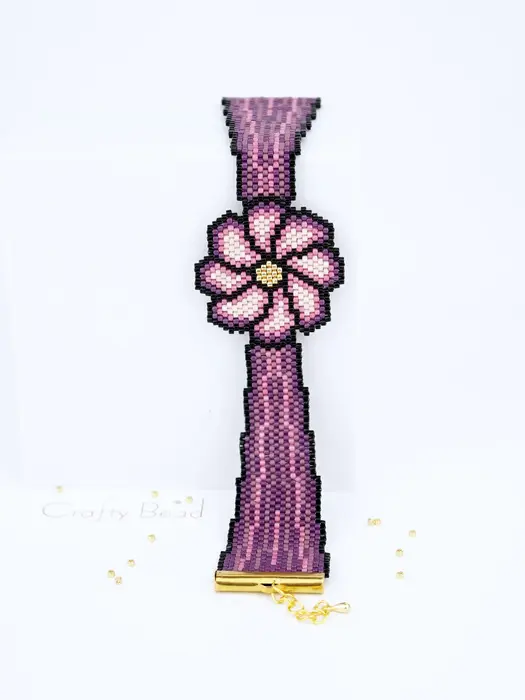 Purple and pink 3D flower centerpiece rises from the cuff. Combined peyote and brick stitch produce a vibrant, boho-inspired bracelet that captures 70s hippie energy while making a standout statement for colorful, expressive style.