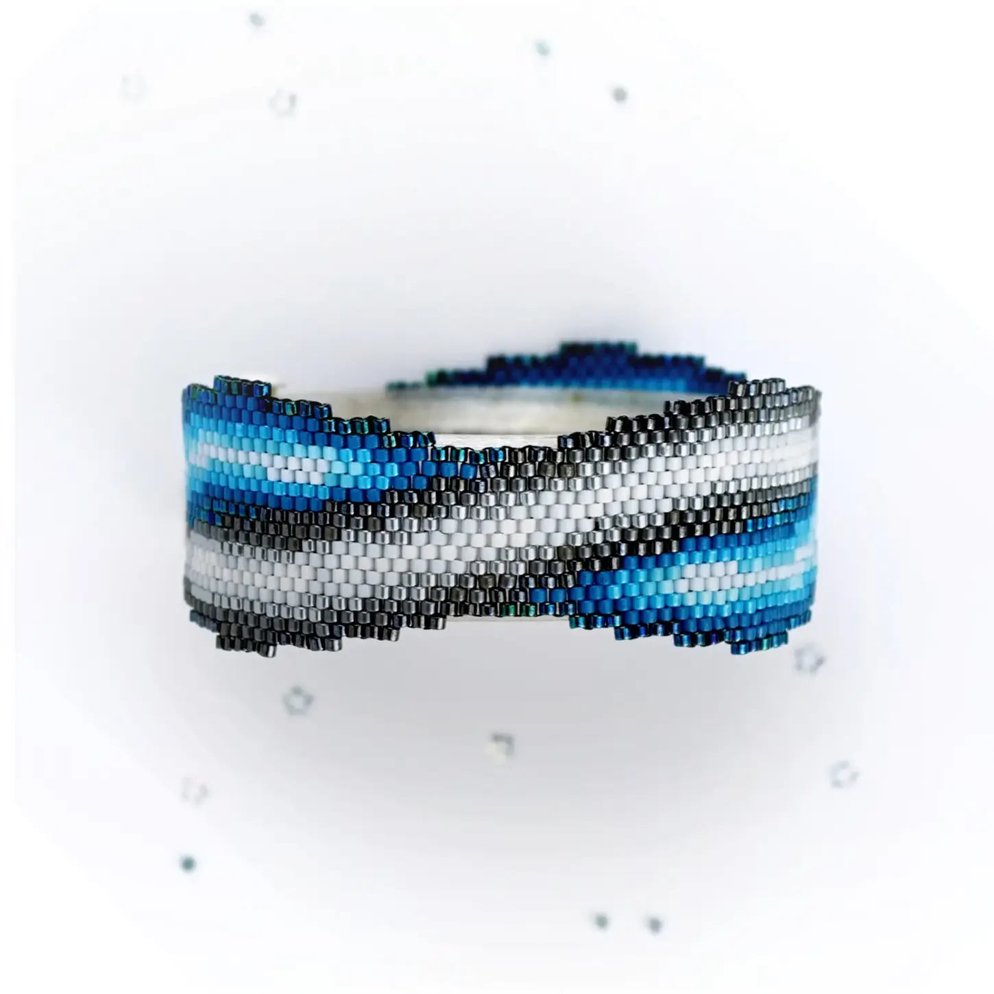 Blue ribbon peyote and brick stitch bracelet pattern with intertwined ombre bands. “Stick Together” creates a striking optical illusion of woven blue and white ribbons in a modern, dimensional cuff design.