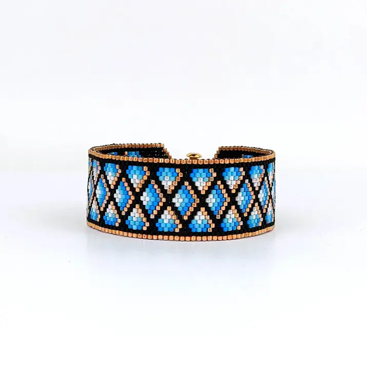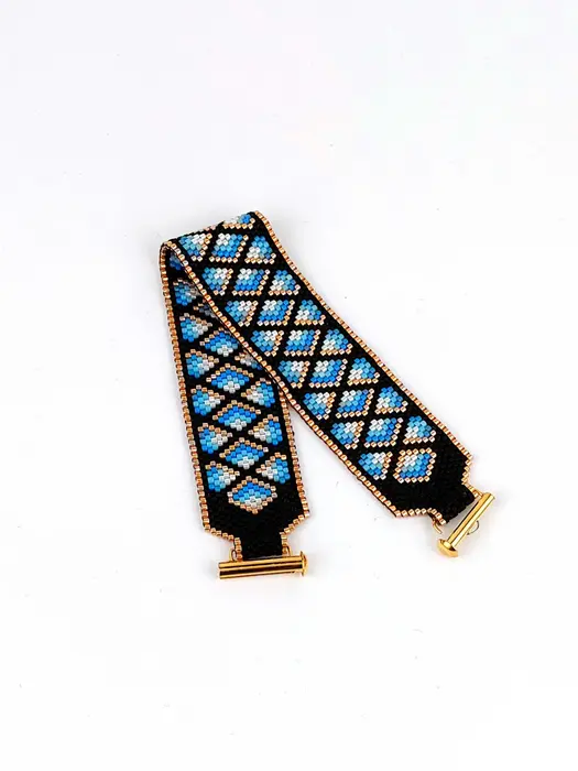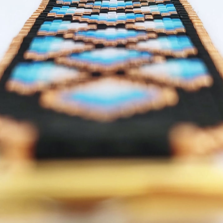 Geometric peyote stitch bracelet in black, gold, and icy blue features a repeating diamond pattern with bold contrast and rhythmic flow. Odd count peyote creates precise edges and a modern, structured beaded design.