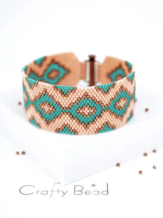 Southwestern tribal shapes in teal and peach form a boho cuff. Odd count peyote stitch centers the design, creating a bold, earthy bracelet perfect for casual, artistic, or festival-ready looks with a strong bohemian vibe.