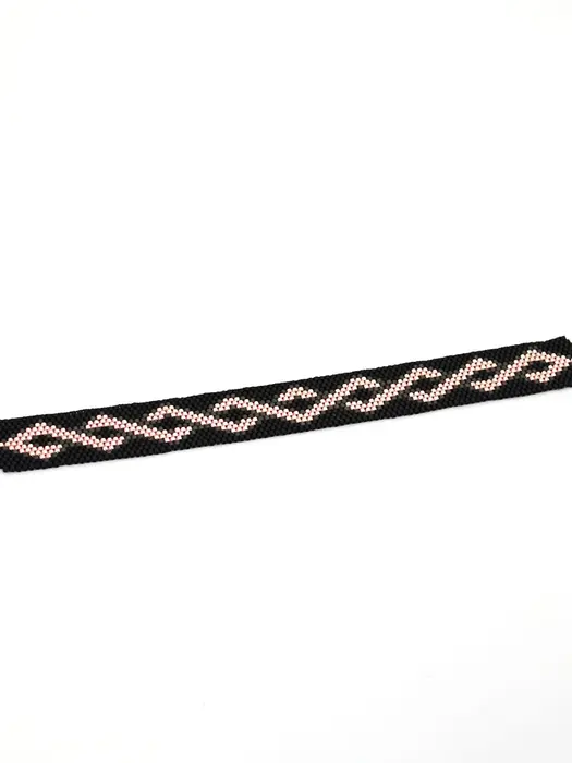 Minimalist odd count peyote bracelet pattern with interlocking rose gold ribbon lines on deep black. “Misty Affair” creates a sleek geometric ornament in a narrow modern cuff perfect for everyday elegance.