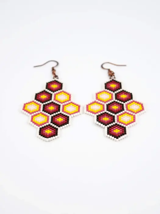 Honeycomb peyote earrings pattern in diamond shape with yellow, pink and deep red hexagons outlined in brown. “Slice of Delight” uses odd count and decreasing stitch to create lightweight geometric dangles.