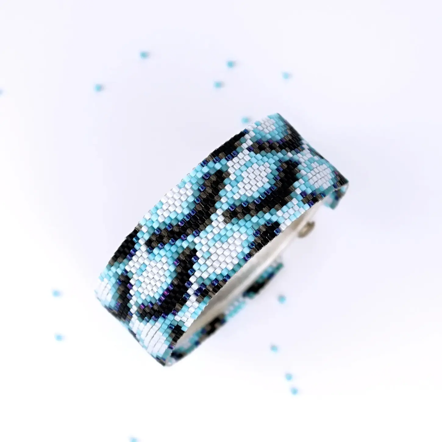 Blue shades peyote bracelet pattern with 3D diamond illusion. “On The Edge” cuff in cool blues, black, and white creates a modern optical effect with even-count peyote stitch, perfect for striking, conversation-starting jewelry.