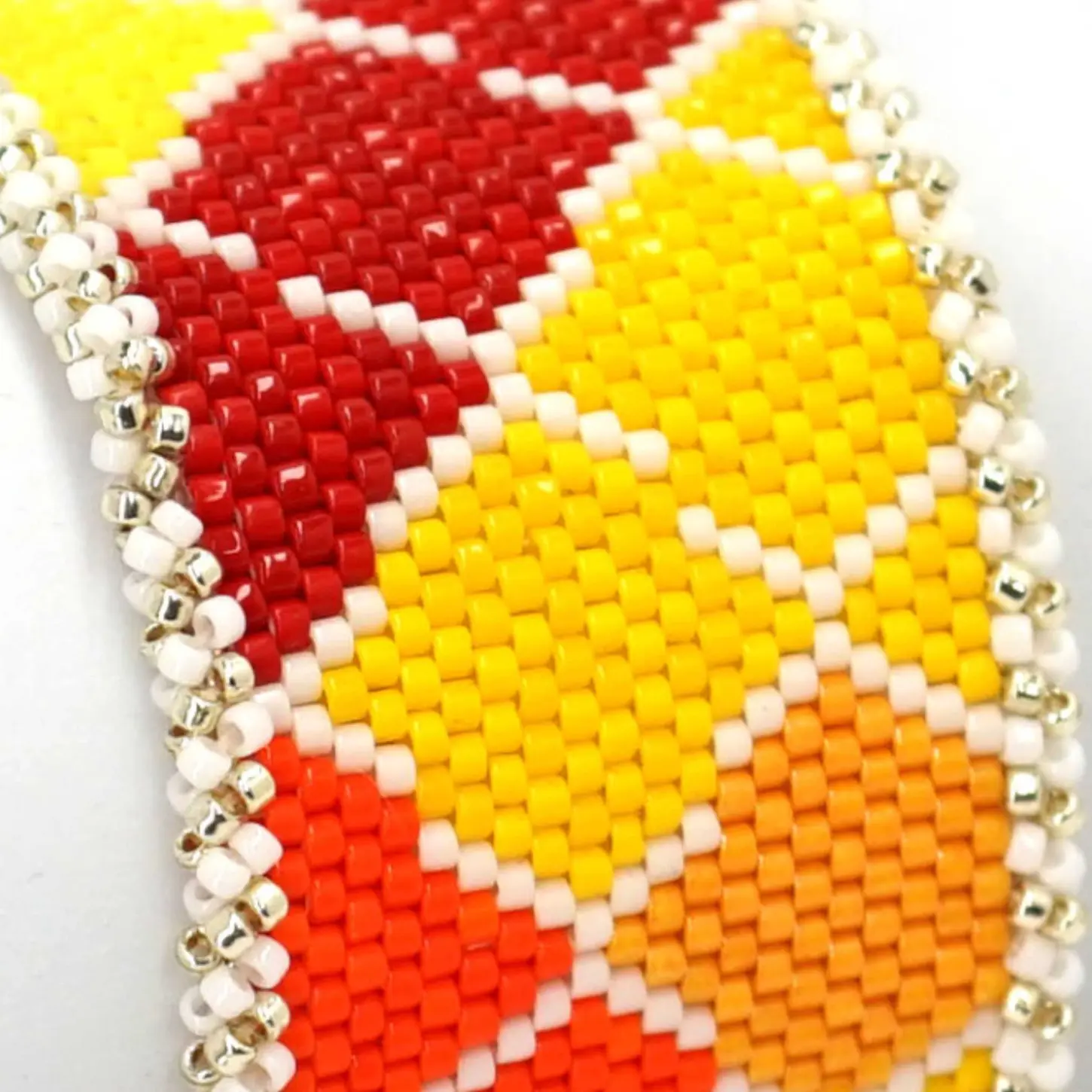 Pop Art peyote bracelet pattern with 60s mod harlequin diamonds in yellow, orange, and red. “Out of Square” cuff includes sparkly looped edge tutorial, perfect for energetic, bold, and colorful wearable art.