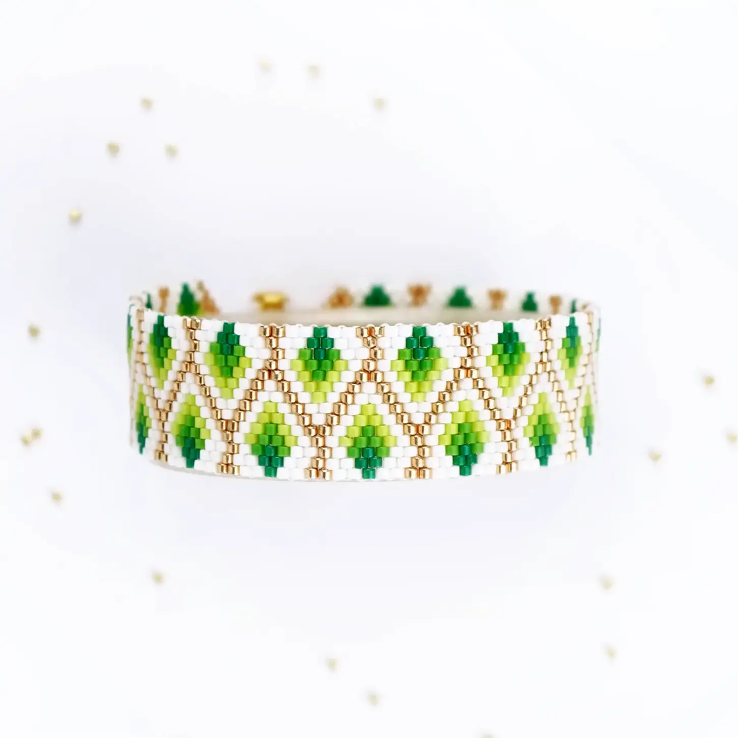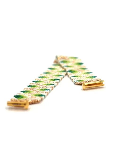 Elegant green peyote bracelet with golden trellis and ombre leaves. “Path of Verdure” cuff evokes a formal garden in shades of emerald, perfect for a chic, nature-inspired accessory or sophisticated handmade gift.