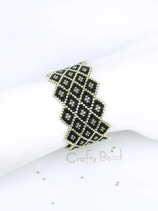 Brick stitch bracelet pattern for silver chainmail-style cuff. “Silverado” mimics dragon scales or armor in silver and black. Intricate brick stitch design with jagged edge makes a bold, edgy wearable statement piece.