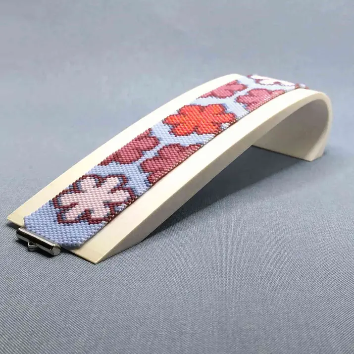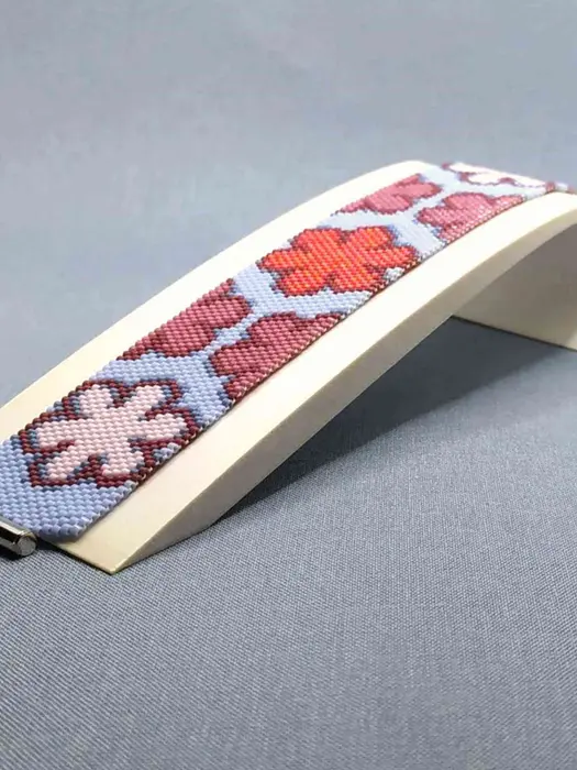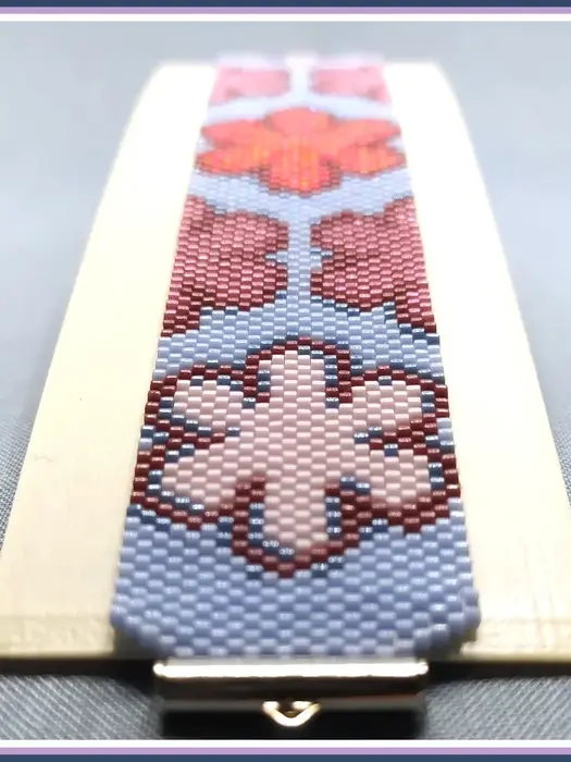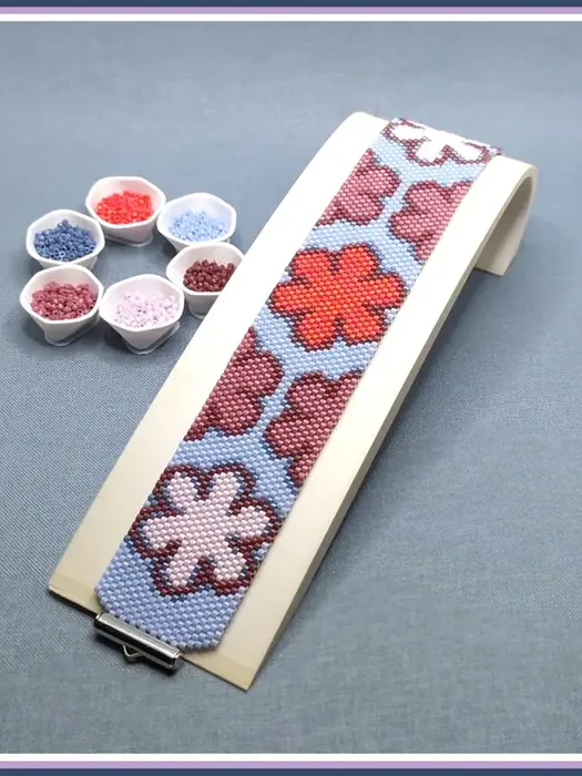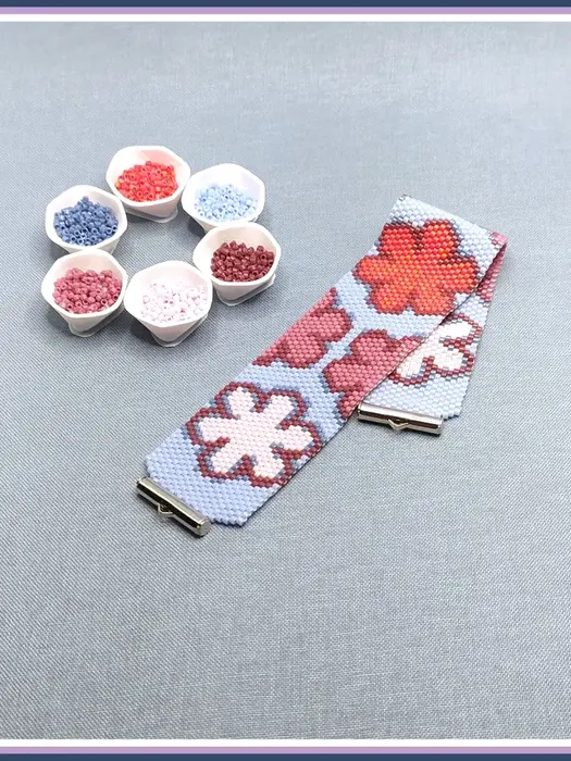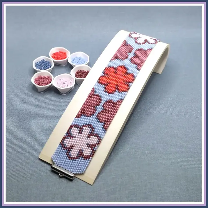 Retro 70s floral peyote bracelet pattern with large stylized flowers in pink, mauve, and coral on light blue cuff. Groovy, pop-art inspired design radiates cheerful, nostalgic Flower Power energy for vibrant wear.