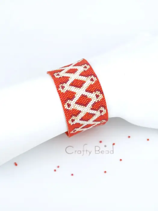 Funny even-count peyote bracelet pattern with corset-style lace-up illusion. “Tie Hard” in red and cream creates a playful optical effect, beginner-friendly and full of attitude, a pop-culture-inspired wrist accessory.
